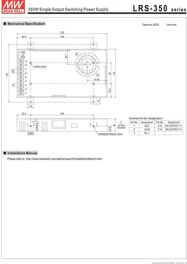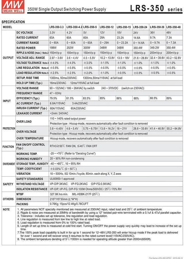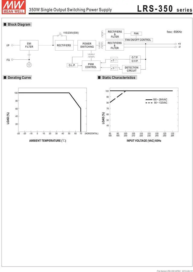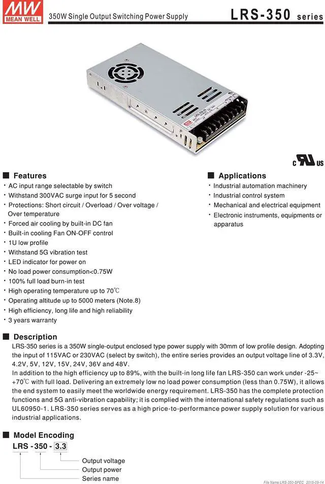 MEAN WELL Single Output Switchable Power Supply, 349.2W 36V 9.7A - LRS-350-36
