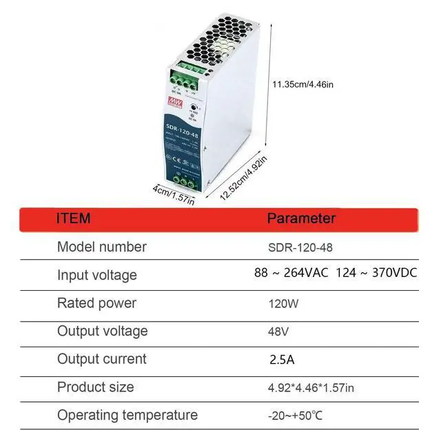 Industrial Equipment: This 48V, 2.5A power supply provides a consistent and reliable output, perfect for powering industrial control systems, automation equipment, and instrumentation requiring a stable 48V source. Handles peak loads up to 150%. ^^ High Efficiency for