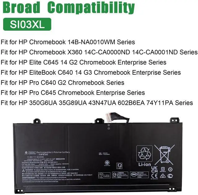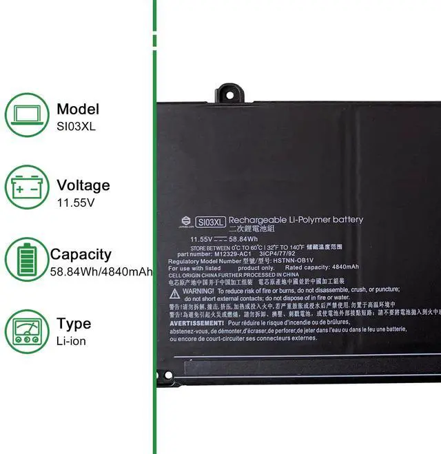 • Model: SI03XL // Voltage: 11.55V // Capacity: 58.84Wh 4840mAh // Color: Black // Type: Plug & Play Li-ion Battery.