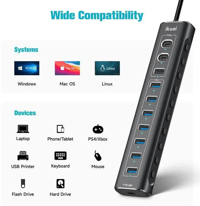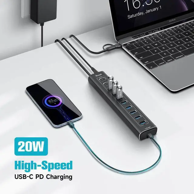 Powered USB Hub, 11-Port ikuai Hybrid USB 3.2 / USB C Hub with PD Charging Port and 60W Power Adapter, Aluminum USB Splitter Including 3 10Gbps Ports and 7 USB 3.0 Ports for PC, Laptop and More