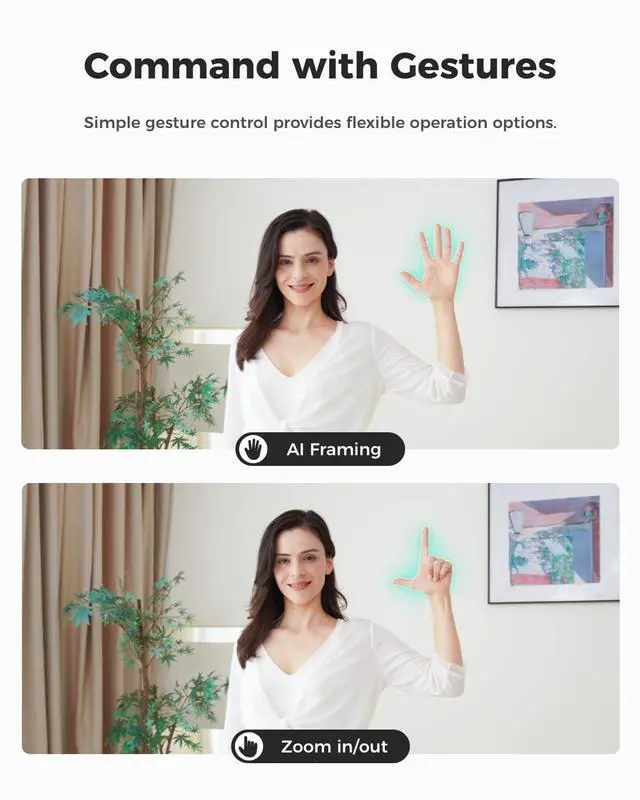 DYNAMIC GESTURE CONTROL 2.0: Say goodbye to tedious manual operations with Dynamic Gesture Control 2.0. Face our PTZ webcam and make a gesture to lock onto a tracking target or a gesture to easily control the zoom. The default gesture zoom is 2x, and the zoom range can be modified through the OBSBOT software ^^