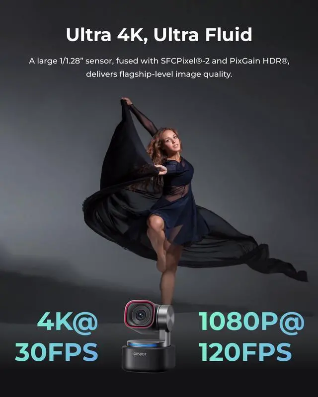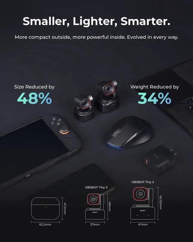 Tiny TitanCompared to its predecessor, the Tiny 3 webcam is 48% smaller and 34% lighter, yet houses a more powerful 1/ 1.28 CMOS. Its also upgraded to a triple-mic array for professional spatial audio. Small form, big performance. ^^ Imaging, UpgradedStunning clarity and smooth motion, in 4K@30FPS or 1080P@120FPS. Dual All-Pixel PDAF keeps every frame sharp by intelligently switching focus modes to match the lighting. Enhanced by a Wide ISO Domain (0-12800) and DCG HDR, the 4K webcam delivers detailed, balanced, and professional results even in low-light scenes.