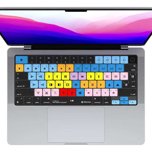 The Editors Keys cover designed for: Avid Media Composer MacBook keyboard cover for the 14" and 16" MacBook Pro. (will not fit other MacBook Models) This cover is the ultimate way to get all of the Avid Media Composer Keyboard shortcuts at your fingertips. Edit faster and protect your Mac. It also helps protect your MacBook Pro 14" and 16" Against spills dust and dirt. Editing. The keyboard cover contains over 100 shortcuts for Avid Media Composer. Each key contains the shortcut icon, shortcut text reference, standard typing letter and colour-coding. The colour coding works by grouping similar tools together in a way which makes your eyes find the tools faster. Accelerate your editing speed in Avid Media Composer by over 40%Protection. In addition to shortcuts, the Avid Media Composer keyboard cover is an ultra-thin keyboard protector which protects your Mac from coffee spills, dust or dirt. The cover is also fully washable, so you can keep your keyboard as clean as possible. Why does it look different to my keyboard? We've designed a special cover that fits over all keyboards from the USA, Canada, UK and Europe so you can be sure your cover will fit like a glove! (A keyboard shaped glove.