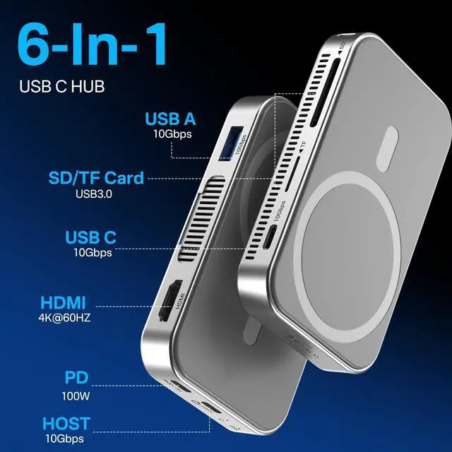 [(6 IN 1 USB C Docking Station)] ACASIS 6 in 1 USB C dock is a multi-function docking station. It features 4K@60Hz HDMI port, SD3.0 card reader, TF3.0 card reader, 10Gbps USB C, 10Gbps USB A port and PD100W port. It is great for laptop/tablet/phone docking station to improve your office efficiency.NOTE:If your phone case with magnetic suction function, you can use ou