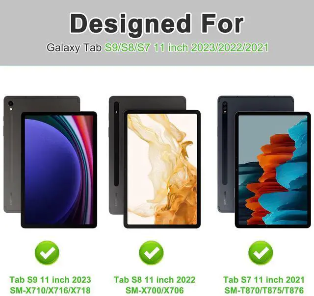 [Compatibility] ONLY designed for Samsung Galaxy Tab S9 FE 10.9" inch 2023 (Model: SM-X510/X516B); Samsung Galaxy Tab S9 11 inch 2023 (Model: SM-X710 /X716B /X718U); Samsung Galaxy Tab S8 11 Inch 2022 (Model: SM-X700 /X706); Samsung Galaxy Tab S7 11 Inch 2020 (Model: SM-T870 /T875/T878U) .
