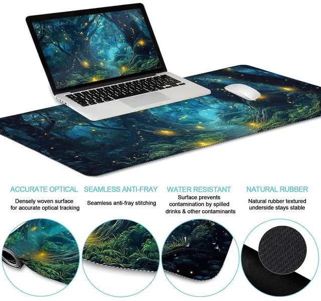 Funny Mouse Pad Set: The aesthetic firefly forest mouse pad set includes large desk mat (35.4x15.7inch), mouse pad with wrist rest(9.8 x 8.6inch), keyboard wrist rest (17.3 x 3.15inch), cup coaster (3.9" x 3.9"). The extended desk pad fits almost full-size keyboards and mice, providing plenty of space for gaming or office work
