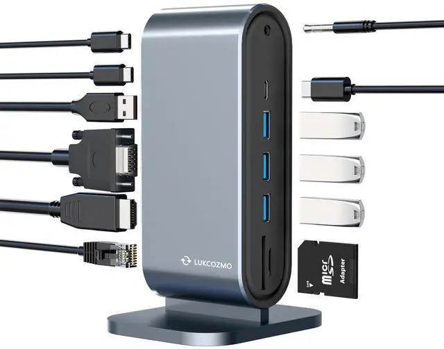 LUKCOZMO USB3.0 Universal Docking Station with 100W Charging, Dual Monitor for Windows and Mac, USB 3.0 or USB-C (HDMI, 1x USB-C, 4X USB3.0,VGA1080P, Ethernet, Audio, TF/SD Card Reader)