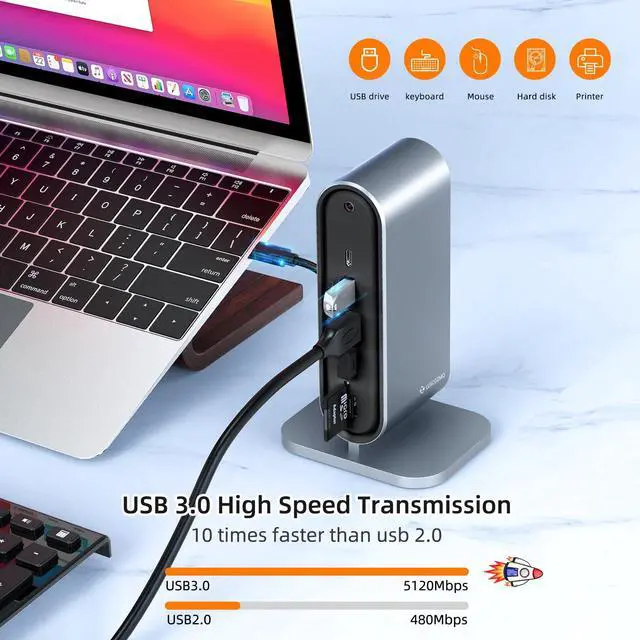 Triple Monitors - The laptop docking station / docking station 2 monitors gets a pristine picture on your main display with up to 4K 30Hz, and on displays two and three resolutions up to 1920x1200 @ 60Hz. Thanks to DisplayLink technology, you can even add three screens to M1 / M2 / M3 Macs with the macbook docking station.