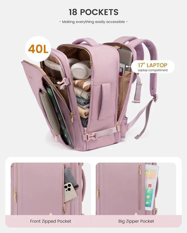 [(40L Large Capacity & Multiple Pockets)] The travel backpack for women with 3 main compartments and 18 pockets, can meet both your daily and travel needs for a 3-5 day trip. Its luggage-style main compartment, separate laptop section, and multi-pocket zipper front pocket offer unmatched convenience.