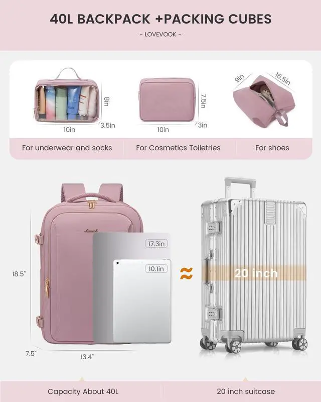 LOVEVOOK Travel Backpack For Women with Waist Strap, 40L Carry On Backpack Luggage Flight Approved,TSA Personal ltem Travel Bag Essentials Fits 17.3 Inch Laptop,Weekender Daypack with 3 Packing Cubes