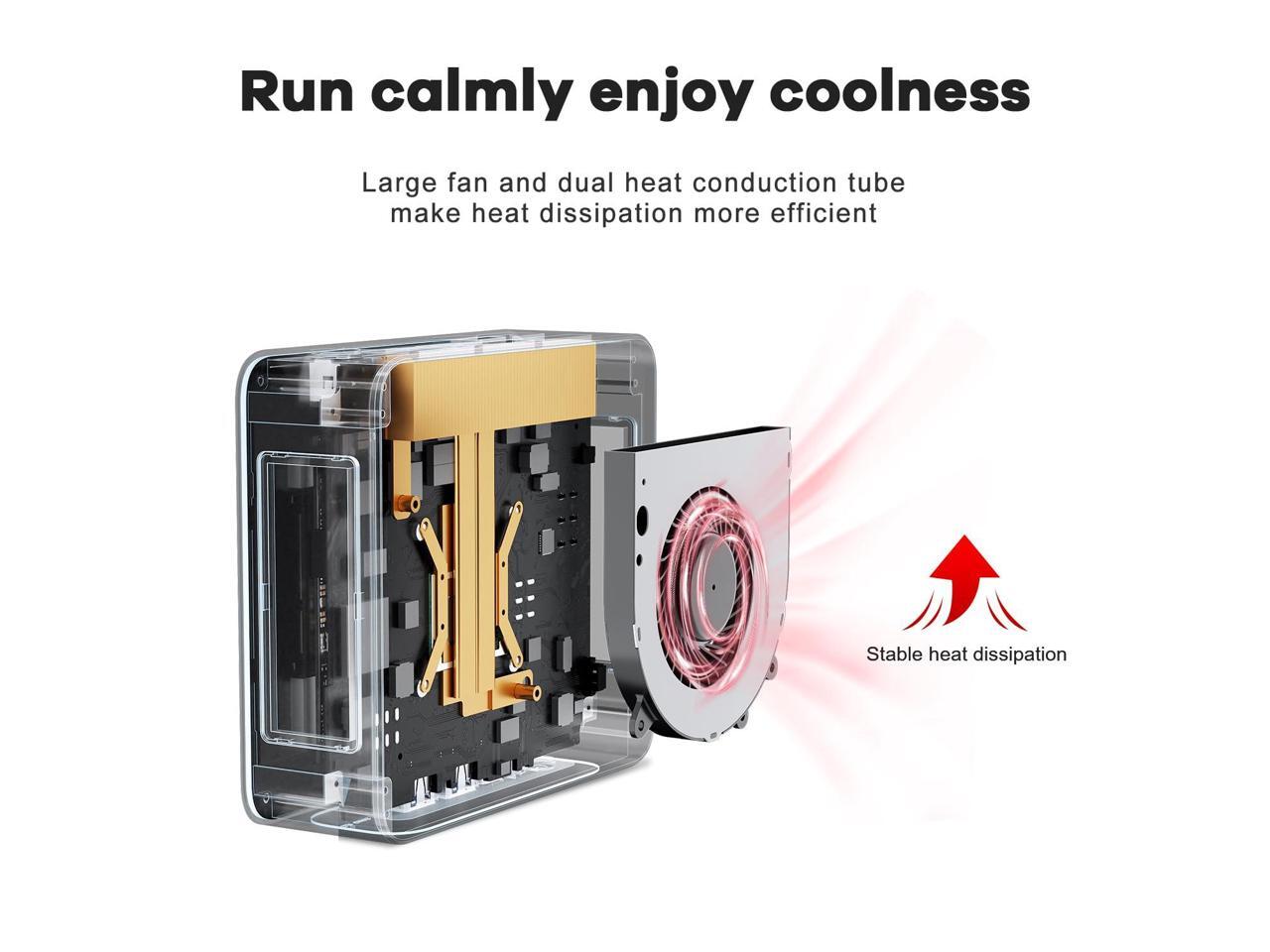 - [( Compact and rich interface )] The size of the 5500u mini pc is only 4.96 x 4.45 x 1.65 inches,small and flexible.Ryzen mini pc is equipped with 1x type-C,1x HDMI,1xDP,3x USB3.2 Gen2, 1x USB 2.0,1x earphone,bluetooth 5.2, WiFi6 with support for RJ45 2.5G network connections. The cooling system consists of a silent powerful fan and heat pipes. It stays quiet ev