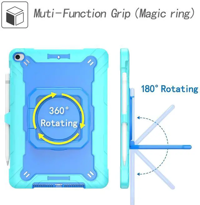 The iPad 10.2 back cover with built-in a 360 degree Swivel turntable magic ring, and 180 degree rotatable bracket kickstand.