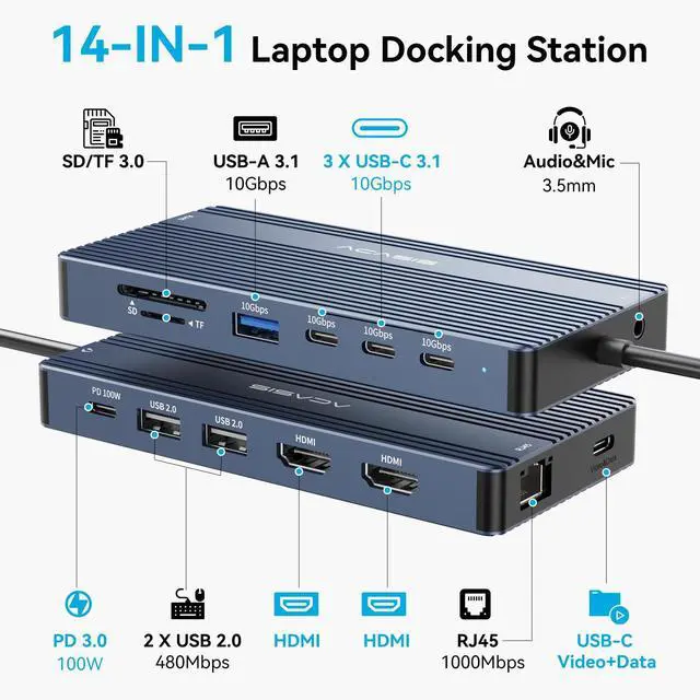 14-IN-1 USB C Video HubPlug and play,ACASIS USB C Docking Station Dual Monitor easily expands your laptop from a single USB C /type C port to a 14-port mobile workstation, This Docking Station with 2*HDMI + 4 *USB C 3.1-10Gbps + 2*USB 2.0,+SD/TF card reader+1000Mbps Ethernet+3.5mm audio and microphone+ PD 100W charging, as well as a full-featured USB C video port.