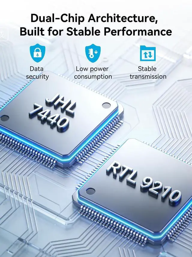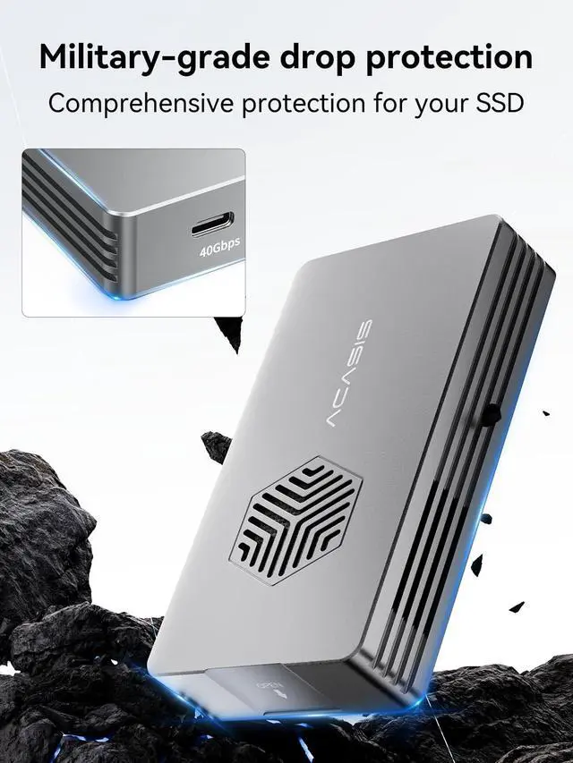 Rock-Solid Stability: Say goodbye to unexpected disconnections and data lossACASIS SSD Enclosure with JHL7440 + RTL9210 dual chips Improve data transmission stability. This effectively reduces the probability of data loss. ^^ Aviation-grade aluminum alloy shields against impact, drops and static. NVMe enclosure Aluminum alloy dissipates and cooling fan heat efficiently, helping keep your SSD cool and extend its lifespan during long transfers and backups ^^ Blazing-Fast Transfer & Universal Compatibility40Gbps M.