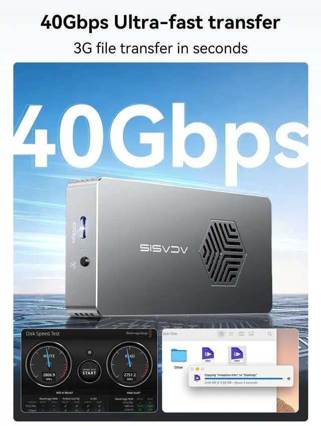 2 NVMe enclosure: 3GB 4K movie in 10s. Plug-and-play, no drivers. Works with Mac/MacBook/PS5 game console/Supports 2230/2242/2260/2280 SSDs (up to 8TB) for storage expansion & 4K/photo/file backup. ^^ Professional Aesthetics & Premium Quality Sleek metal exterior complements Mac devices, elevating your desktop setup. Aluminum alloy build + smart cooling fan ensures stable heavy-workload performance for designers, photographers, programmers. ^^ What you will get 1. Acasis 40Gbps M. 2 NVMe SSD enclosure 2. 40Gbps cable 3. User manual 4. 24-month warranty 5. Technical support ^^ Why can't I reach the expected speed? --Expected read/write speeds are 2500-3000Mbps due to the 18Gbps available bandwidth of the Dp signal.