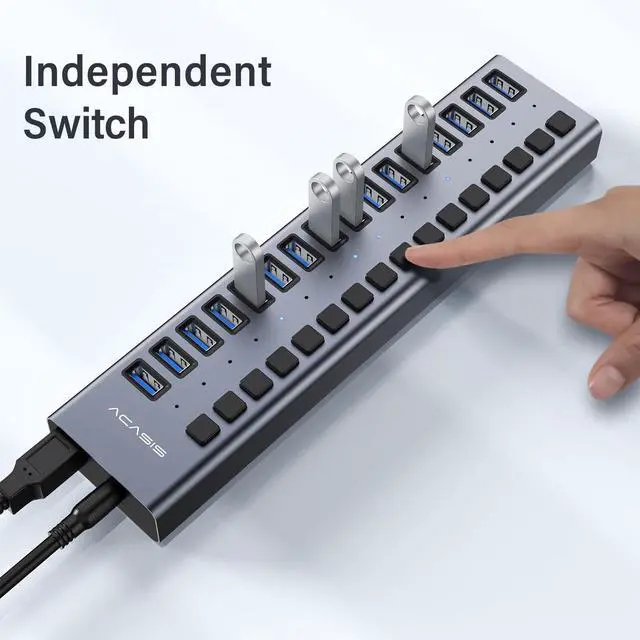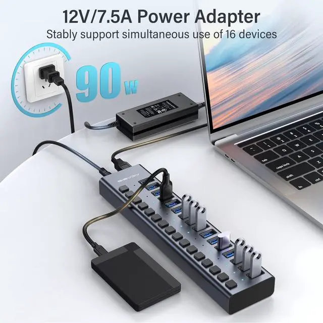 USB 3.0 Hub: Enhanced power (12V 7.5A ) for more stable support of multiple devices, you can charge your devices like mac, mobile phones, tablets or other devices safely without any pressure. Built-in surge protector keeps your devices and data safe and supports hot swapping. ^^ Aluminium Alloy HousingACASIS usb hub powered build with quality aluminium alloy, which can helps disspate heat quickly and no worries from falling out from your desk when you plug many devices. ^^ [Independent Switch]- Each high-speed USB 3.0 (5Gbps) port of the 16 port USB 3.0 (5Gbps) hub has an independent switch, which is more secure, and can be directly pressed to turn on without removing the USB port cable. Each USB fast charging port of the multi USB Hub can deliver up to 2.1A of current. ^^ [Wide Compatibility] -16 port USB 3.1 (10Gbps) powered is compatible with most operating systems: Windows XP/Vista/7/8/10, MacOS-8/9/X, UNIX, Linux and offers fast PLUG-AND-PLAY installation.