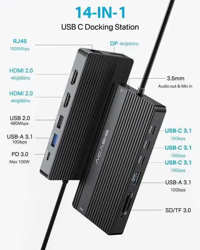 • 14-in-1 USB C Docking Station for Laptop: ACASIS Docking Station Dual Monitor easily expands your laptop from a single USB C/thunderbolt 3/4 to a 14-port workstation, with 2 HDMI and 1 DP at 4K@60Hz, 3*10Gbps USB C 3.1, 2*10Gbps USB A 3.1, 1xUSB 2.0, SD/TF card reader, 1Gbps Ethernet,3.5mm audio and microphone, and PD 100W charging