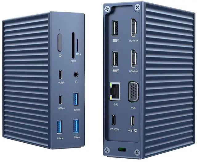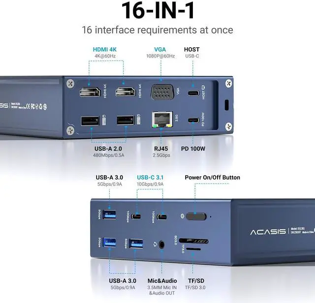 Laptop Docking Station Dual Monitor: This 16-in-1 usb c hub easily expands your laptop into a 16-port workstation, with 2*4K HDMI, 1080P VGA, 2*10Gbps USB C 3.1, 3*5Gbps USB A 3.0, 2*USB A 2.0, SD/TF card reader, 2.5G bps RJ45 Ethernet, 3.5 mm audio and microphone, and PD 100W charging ^^ 2