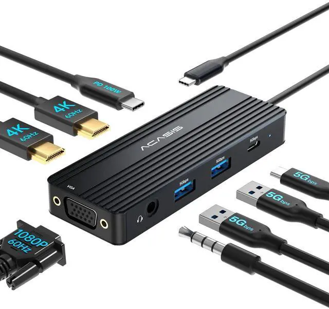 Hub USB C 8 em 1 com Duas Saidas HDMIACASIS Esta docking station multifuncional 8 em 1 da ACASIS pode ser uma excelente maneira de aumentar sua produtividade no escritorio, equipada com duas portas HDMI 4K@60Hz, uma porta VGA 1080P@60Hz, uma porta de carregamento PD 100W, uma porta USB-C de ate 5Gbps, duas portas USB-A de ate 5Gbps e entrada de audio 3.5mm. Versatil e completa, este adaptador HDMI dual para monitor e ideal para trabalho eficiente em casa ou no escritorio.