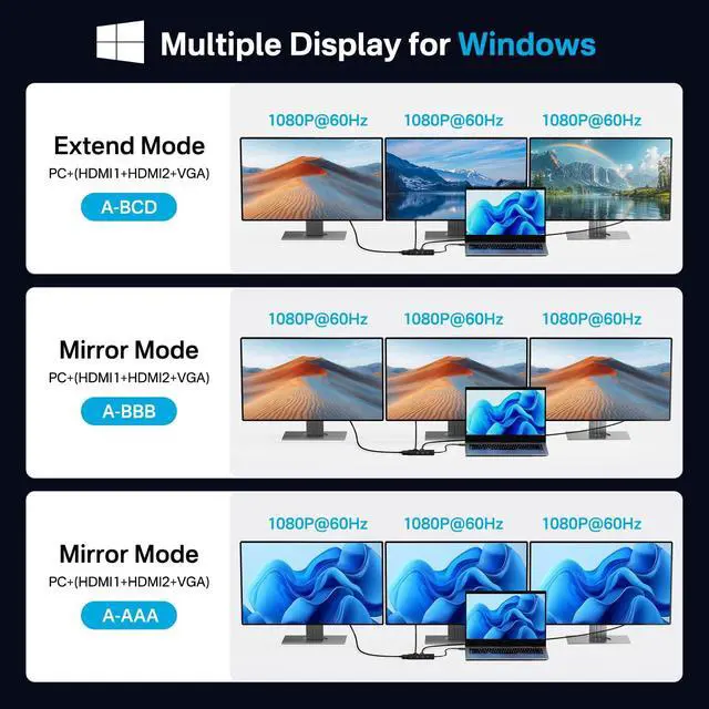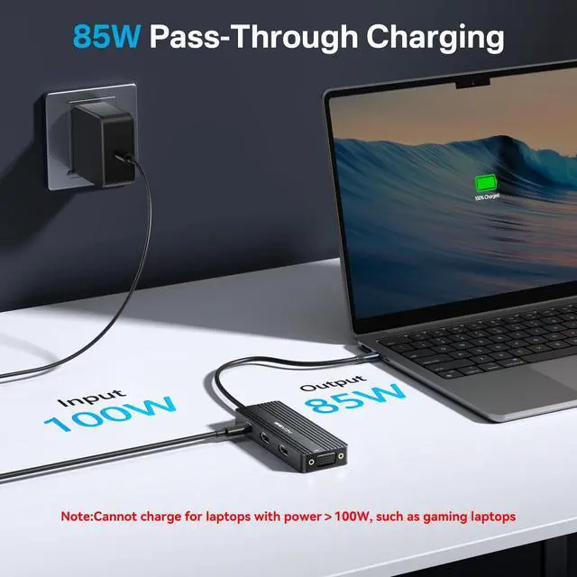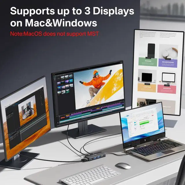 Docking Station para Monitor Dual HDMIA docking station possui 3 portas de saida de video: 2 portas HDMI + 1 porta VGA para suportar saida de video dual/tripla de ate 4K; se a porta VGA for conectada, afetara a resolucao de todos os monitores, limitando-a a apenas 1080P! Observe: A expansao para 3 monitores e suportada apenas pelo Windows OS (com suporte a MST), o macOS nao suporta MST.