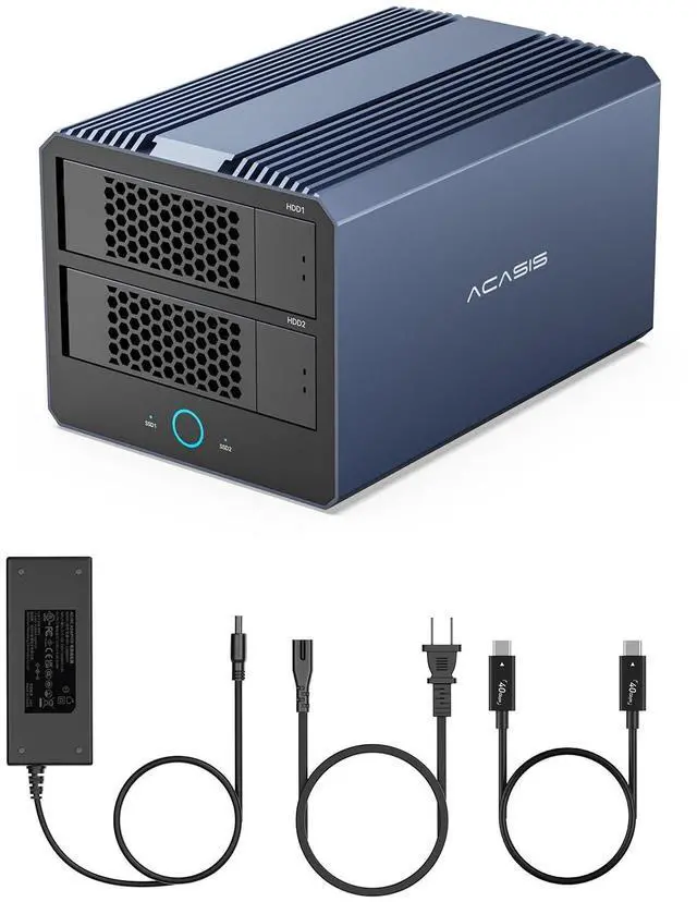 Note: Your monitor needs to support 8K@60Hz. ^^ Active Cooling + 96W Power in a Premium Aluminum CaseBuilt with a premium aluminum chassis and an active cooling fan, this cooling fan hard drive enclosure delivers rock-solid stability and heat managementeven during demanding workloadswhile the included 96W power supply ensures consistent, high-performance power delivery to keep your drives and devices running smoothly and reliably all day long. ^^ Built for Thunderbolt & USB4Equipped with a USB4 40Gbps host interface, this usb enclosure delivers blazing-fast transfers up to 40Gbps when two SSDs are configured in RAI