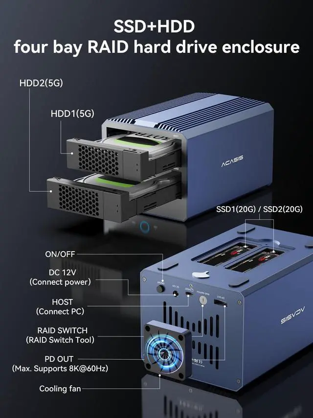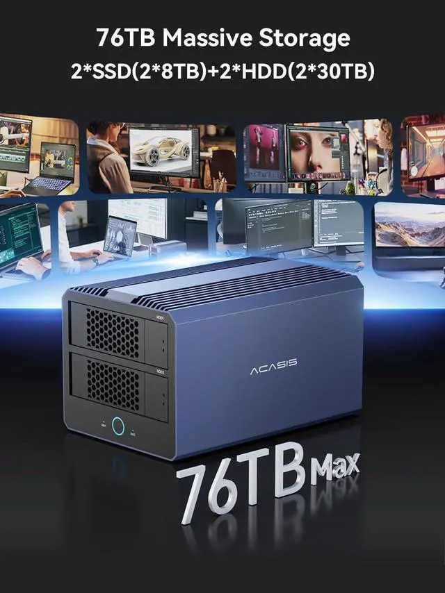 RAID Enclosure: Budget HDDs + High-Speed SSDs in OneThis ACASIS 4-Bay enclosure combines high-speed NVMe SSDs (up to 40Gbps) for active projects with budget-friendly HDDs for mass storageletting you pay only for the speed and capacity you need. Questions about setup? We'll respond within 24 hours to help.