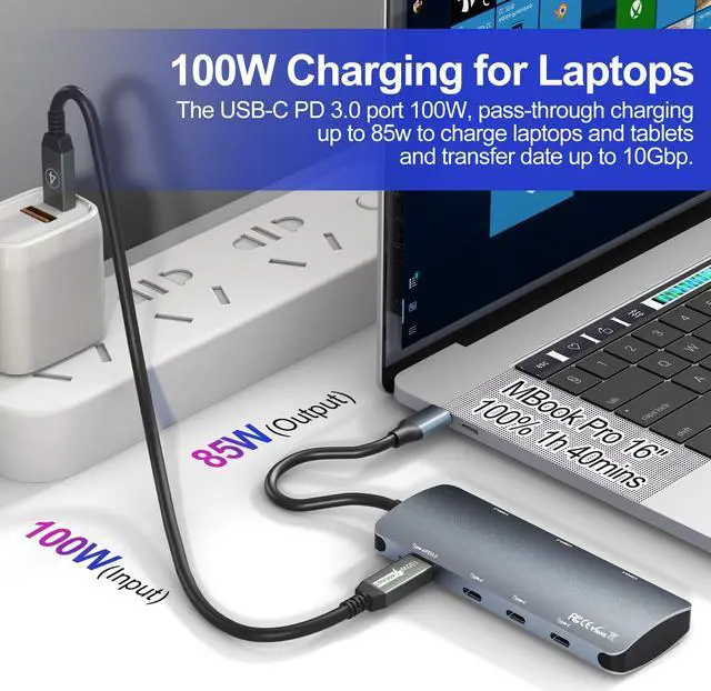 [(100W Fast Power Delivery)] One USB-C 100W Power Delivery port 3.0 with pass-through charging up to 80W output to charge your laptops, Pads, Mac Book Pro & Air or other Type-C devices and transfer data up to 10Gbps. So you can safely charge your laptop while connecting multiple peripherals for data transfer and hassle-free power storage. Support system: Windows/Mac/i Pad OS/Linux/Android. (Note: USB-C PD charging port is only applicable to USB C port that supports PD protocol).