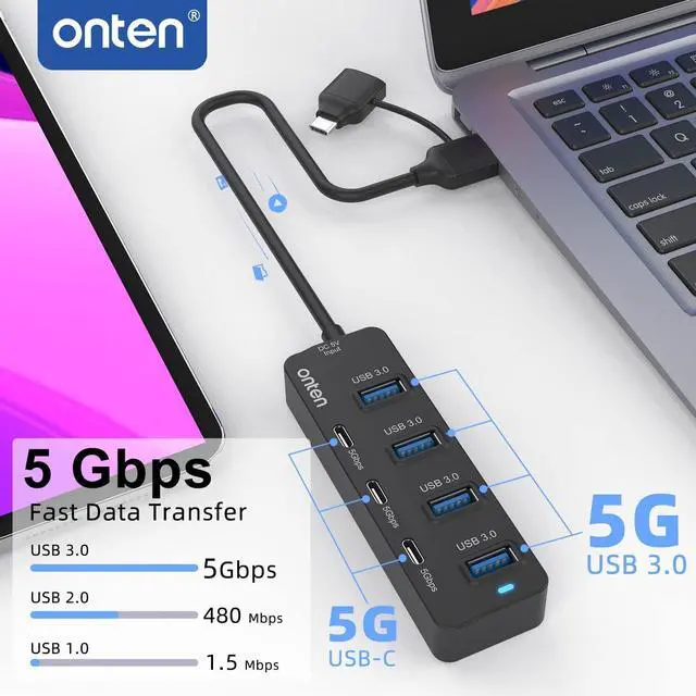 High Speed: Transfer HD movies or large files in just seconds with super fast data transfers of speed up to 5Gbps, 10X faster than USB 2.0 (480 Mbps). Onten USB C hub, with built-in OTG function chip, easily connects with (wireless/wired) mouse, keyboard, USB drive, and other USB devices to your USB-C phone or tablet.