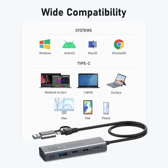The USB 3.2 GEN 2 HUB. Has both USB-A and USB-C connectors, (The USB-C connector speed is up to10Gthe USB-A connector speed isHigher than 5G but less than 10G ) it can be used on almost all computers and cell phones, has 2 USB 3.2 GEN 2 10G high-speed ports and 2*USB C 10G ports, and