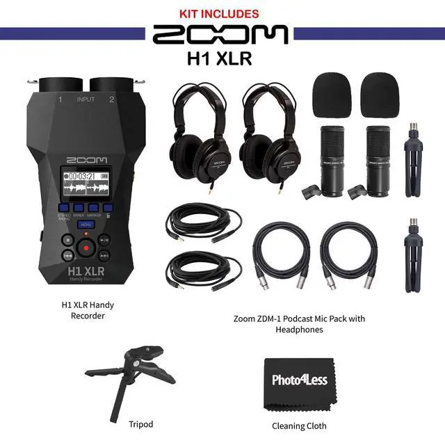Bundle Includes: Zoom H1 XLR Handy Recorder2X Zoom ZDM-1 Podcast Mic2X Headphones2X Windscreen2X XLR Cable2X Tabletop StandTable Tripod Hand GripBlack Cleaning Cloth