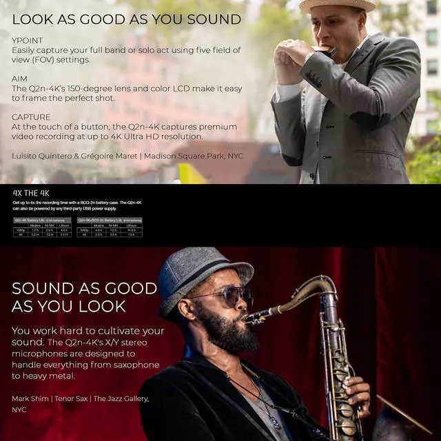 Its fixed-focus, wide-angle lens has a native 150 FOV and five selectable FOVs for framing wide and close-up shots as you choose. A wide f/ 2.8 lens aperture produces clear images in dimly lit locations and is augmented by 12 selectable scene modes. Each scene corresponds to a popular performance situation like Concert Light, Jazz Club, Outdoor, Monochrome, and Sepia. An automatic setting chooses the optimal scene mode based on ambient light. The Q2n-4K's stereo condenser mics are arranged in an X/Y pattern and can handle sound pressure levels up to 120 dB, standing up to even loud rock stages.