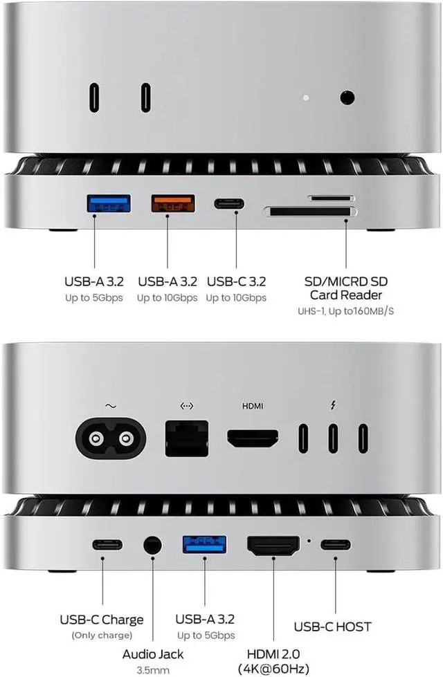 USB-C Hub for Mac Mini Dock & StandThe 10-in-1 Mac Mini Stand & Hub adopts the sleek brushed finish and silver aluminum design of the Mac Mini M4. Equopped with with M. 2 SSD enclosure fits NVMe/SATA M. 2 SSD, 4K60Hz HDMI, 10G USB A/C, 5G USB A*2, USB-C Charge, SD/TF and Audio, the Mac Mini M4 Dock not only improves convenience but also effectively avoids Wi-Fi signal interference, improving your work efficiency. ^^ Internal Storage Expansion with M. 2 SSD EnclosureThis Mac Mini docking station comes with the SSD enclosure that supports M.