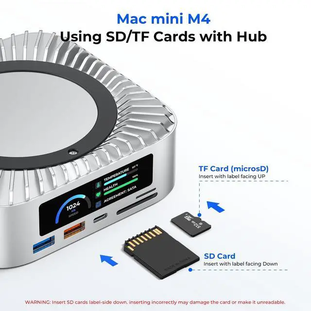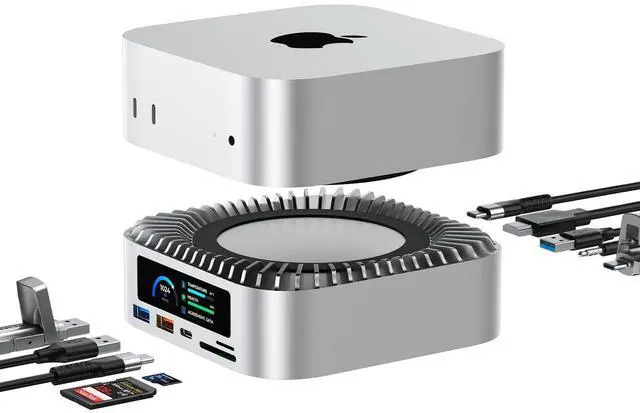Innovative Smart UI Display ScreensFeatures 5 Smart UI Display Interfaces that automatically cycle every 10 secondsshowing startup animation, power status, M. 2 SSD info, data port activity, and HDMI connection. When devices are inserted, the related screen displays instantly for quick status feedback. ^^ Built-in 8TB M. 2 NVMe/SATA SSD EnclosureThis Mac mini M4 docking station includes a built-in hard drive enclosure supporting both M. 2 NVMe and SATA SSDs up to 8TB capacity. It's compatible with most SSD sizes (2230/2242/2260/2280).