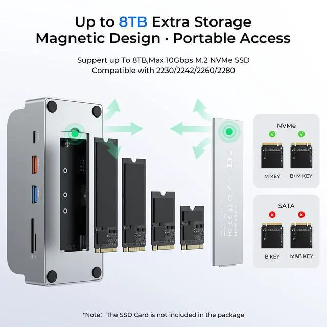 10-in-1 Mac mini Dock with M. 2 SSD Expansion This Mac Mini M4 docking station turns your Mac mini into a powerful workstation with 10 ports including USB-C 10Gbps, USB-A 10Gbps/5Gbps, HDMI 4K@60Hz, Gigabit Ethernet, SD/TF card reader (up to 160MB/s), 3.5 mm audio, and PD charging. Supports M. 2 NVMe SSDs up to 8TB for massive storage expansion. ^^ 4K HDMI & High-Speed Data Transfer Enjoy ultra-high-definition video output with HDMI 4K@60Hz support, backward compatible with 1080p/720p. Transfer files at blazing speeds with USB 3.2 Gen 2 ports (10Gbps) and NVMe SSD support for seamless workflow and media editing.