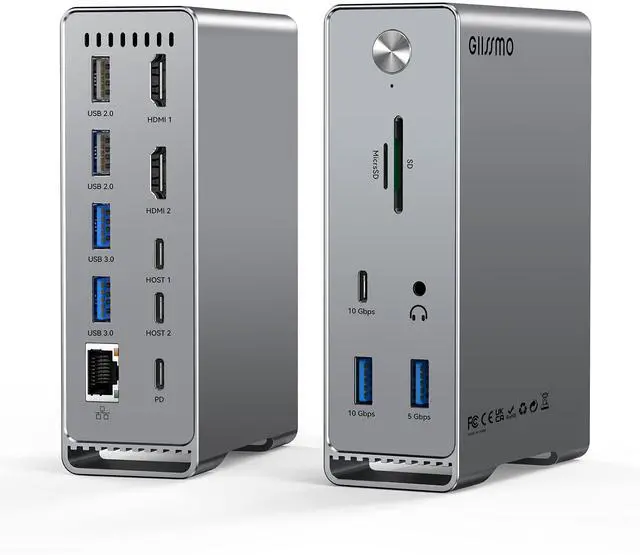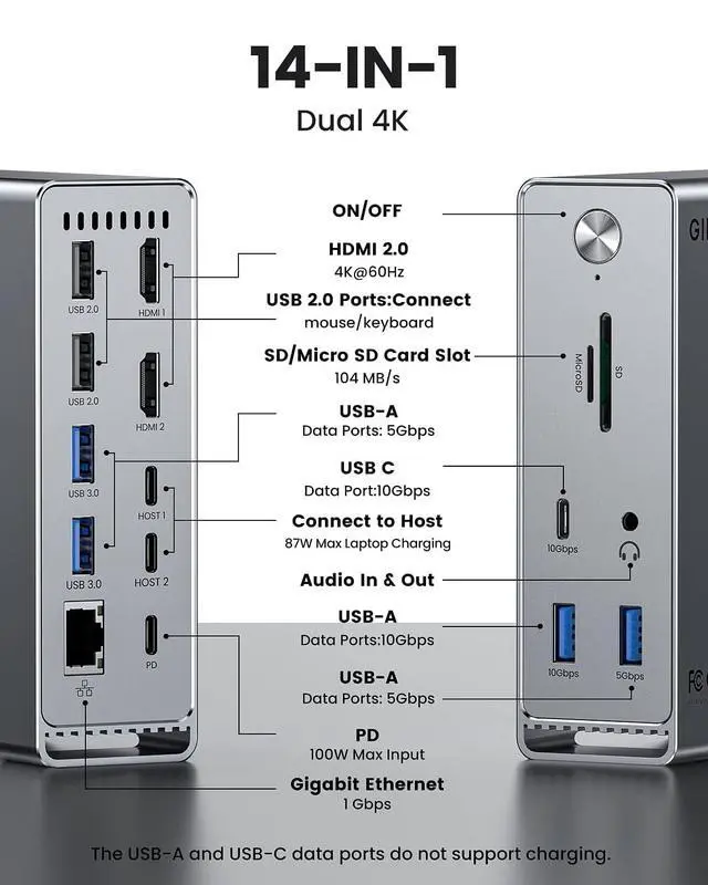 All The Ports You NeedDocking station for MacBook Pro/Air with dual 4K@60Hz HDMI ports, 10Gbps USB C data port, 10Gbps USB A data port, 3 USB 3.0, 2 USB 2.0, 3.5 mm Audio, RJ45, SD/TF card slots, 100W PD. And, an *ON-OFF* switch can with use and opening, you don't have to continue plugging and unplugging cables, it is as considerate as your desktop host. Suitable to connect multiple devices. ^^ Dual 4K Extend MonitorWith 2 HDMI ports of this Mac docking station, your MacBook Pro or MacBook Air can extend 2 4K@60Hz monitors at the same time.