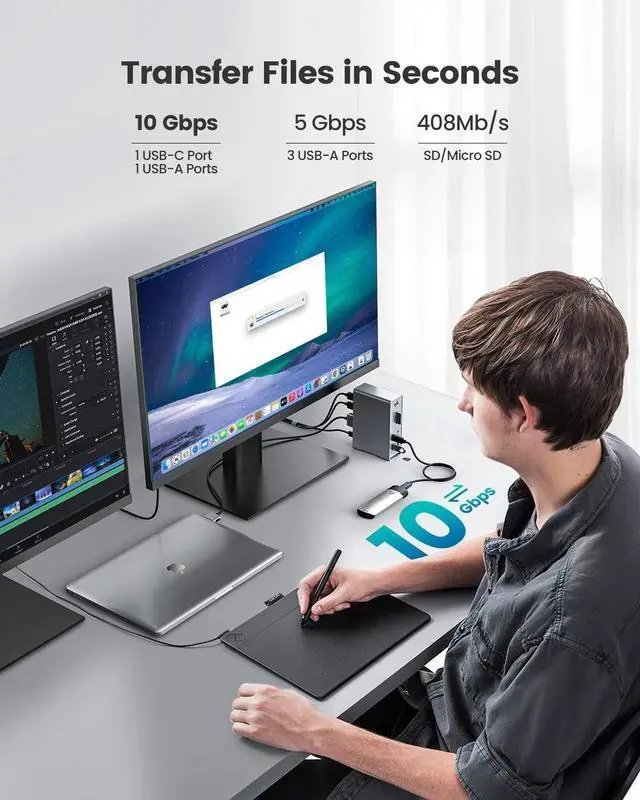 Mirroring or Extending, no driver, no set, just plug and play, which means you will have 3 UHD screens with different content at a time! Users on DP 1.4 can connect up to dual 4K 60Hz displays, whilst users on DP 1.2 Macs can connect up to 1 4K 60Hz and 1 4K 30Hz displays. ^^ Superspeed Data Transfer-10Gbps10Gbps USB-A and 10Gbps USB-C data port on the front of the MacBook Pro dock. Their super-speed data transfer is ideal for drive and HDD devices, the time required to transfer a 20G file just needs 16.4 s! And together with the SD/TF card slots, you can transfer data between devices at some fast speeds! In addition, the MacBook Pro Adapter also offers 2 USB 2.0 ports to connect your wireless keyboard and mouse without any lag.