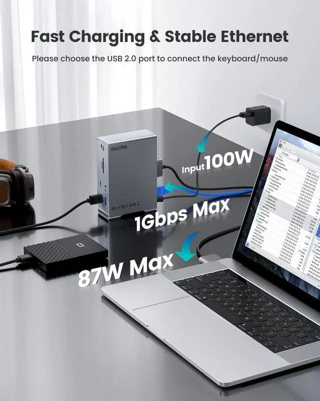 ^^ Design for MacBook Pro/Air MacBook docking station dual monitor also has an 87W PD 3.0 Port, an 3.5 mm audio port, and an RJ45 Gigabit Ethernet port, Work with MacBook Pro and MacBook Air, including Apple M1 Pro, M1 Max, M1 Ultra, Intel based MacBook, while users on original M1 Macs are limited to a single display only. And due to the Double-ended USB C Cable, the 5E01 can not work with MacBook Pro before 2016 and MacBook Air before 2018. ^^ 2-Year Warranty With this Macbook Pro docking station, you will get a GIISSMO 14-in-2 MacBook dock, a double port USB-C to USB-C cable, a welcome guide, our care-free 24-month warranty, and friendly customer service.