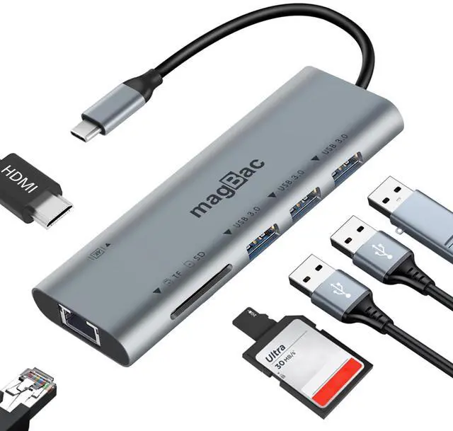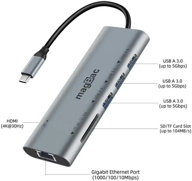 MagBac USB C Docking Station 7 in 1 USB C HUB Multiport Adapter with 3 5Gbps USB A Port, 1 HDMI 4K@30Hz, Gigabit Ethernet, SD/TF Card Slot for Windows and MacOS Laptop with Full-Featured Type C Port
