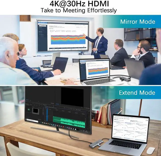 USB C DOCKING STATION: The docking station integrates 7 ports, including: USB A 3.0 port*3, 4K@30Hz HDMI port*1, 1000Mbps ethernet port*1, SD/TF card slot. It allows your laptop to expand from one USB C port to seven different functional ports, thereby connecting more external devices.