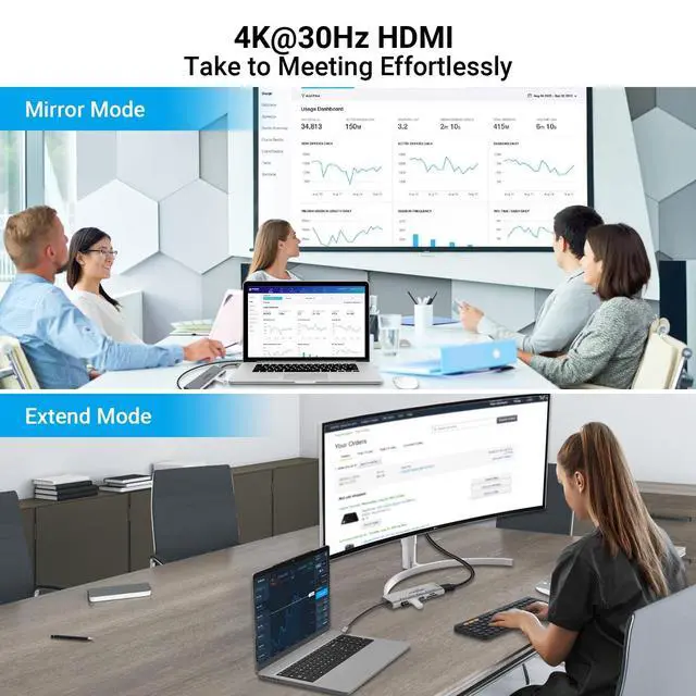 Video Output: The USB C docking station allows you to mirror or extend the display of laptop to a TV, monitors, projectors, and other devices with HDMI ports. Supports resolution up to 4K@30Hz. You can split the screen for multitasking or improve work through extended modes. You can also use mirror display mode to display the same content on two screens. ^^