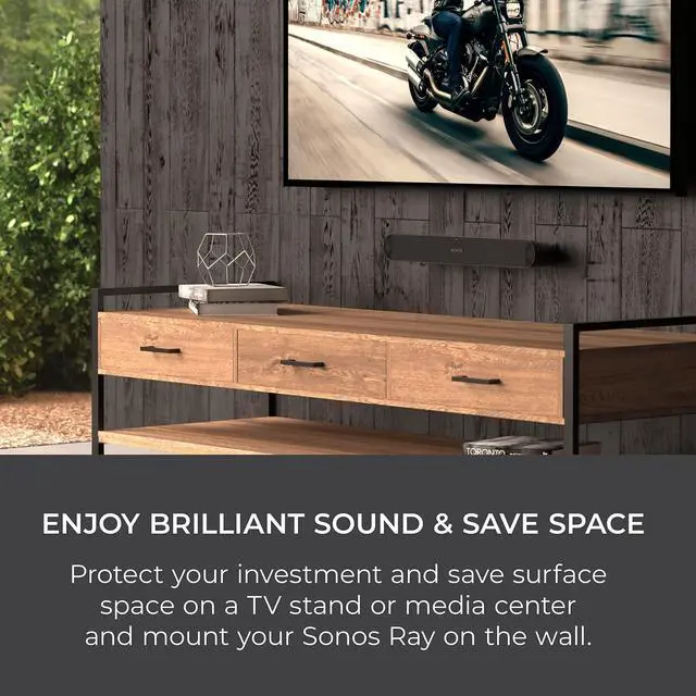 Enjoy brilliant sound and save space: Get your Sonos Ray mounted and protect your investment. Save surface space on a tv stand or media center and mount your Sonos Ray on the wall. Position your soundbar wall mount at the ideal height for your entertainment center.