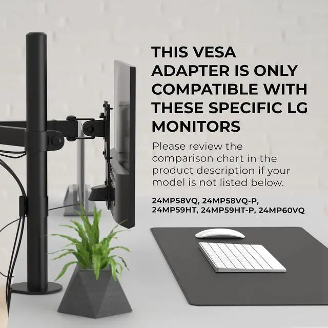 This VESA mount adapter is designed for these specific monitor model numbers: 24MP58VQ, 24MP58VQ-P, 24MP59HT, 24MP59HT-P, and 24MP60VQ. It is only compatible with these models and will not fit other monitors. Always double-check your monitor model number before ordering. If you arent sure if it will fit your monitor, please ask. ^^ Mount your non VESA monitor on a standard VESA mount with
