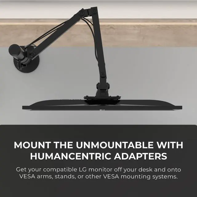HumanCentric adapters: Use this adapter to attach certain LG monitors to arms, stands, and desk mounts. The mount adapter makes your monitor attachable to standard monitor mounting sizes of 75x75 mm and 100x100 mm found on most workstation VESA mounts. ^^ Quick and easy installation with hardware included: Youll be able to install this adapter for your compatible monitor in only a few minutes with nothing more than a screwdriver. Just remove the existing base and screw ours in place instead. Then connect it to your VESA mount. ^^ HumanCentric designs with you in mind: we are the worlds largest brand and manufacturer of VESA mount adapters. They're made with steel and built to be safe, durable, and easy to use. Improve your workstation with our adapters to eliminate clutter, improve ergonomics, and increase your comfort and productivity at your desk. ^^ If you have any problems with your mount, send it right back to us. Our bracket will fit your monitor.