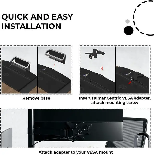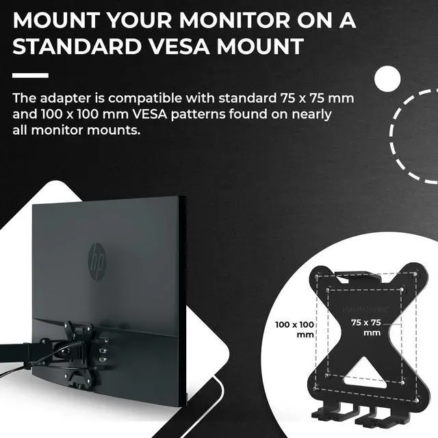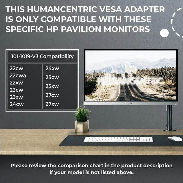 HP Pavilion monitors: This bracket is only tested and guaranteed to work with: HP Pavilion 22cw, 22cwa, 22xw, 23cw, 23xw, 24cw, 24xw, 25cw, 25xw, 27cw, 27xw ^^ Even though these monitors werent made with mounting holes, our convenient bracket enables you to connect your monitor anyway. Whether youre looking to mount it on the wall or just get it off your desk, this bracket will let you connect your monitor in seconds. ^^ Quick and easy installation with hardware included: Youll be able to install this VESA adapter for your compatible Samsung monitor in only a few minutes with nothing more than a screwdriver. Just remove the existing base and screw ours in place instead. Then connect it to your VESA mount. ^^ If you have any problems with your mount, send it right back to us. Our bracket will fit your monitor.