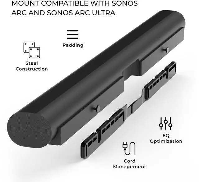 Sonos Arc Ultra soundbar: Mounting bracket includes all hardware to mount your Sonos Arc on the wall. The wall mount bracket is only compatible with the black or white Arc and Arc Ultra. It is not compatible with any other soundbars. Designed for Sonos Arc and Arc Ultra owners who want a clean, minimalist home theater setup and value clean, professional-looking setups.