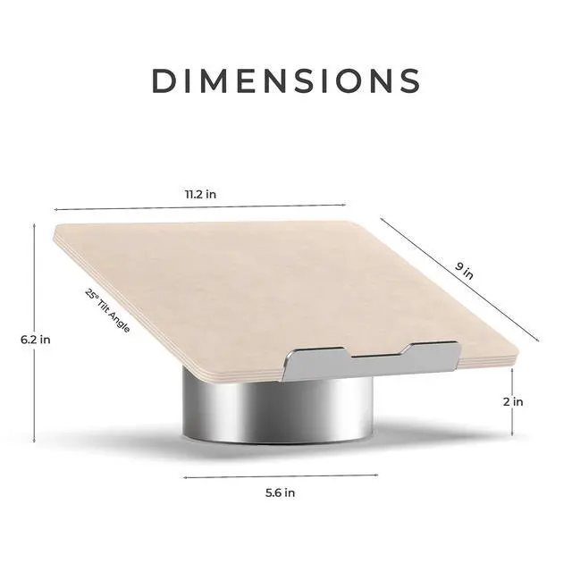 ^^ Dimensions and specifications: 25 degree angle tilt, 5.6 inch metal base diameter. 11.2 inch width x 9 inch length top platform, 6.2 inch rear height, 2 inch front height. See product images for detailed dimension graphic.