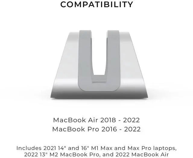 MacBooks: Connect an external monitor, keyboard and mouse to your MacBook, then dock the MacBook Pro or MacBook Air and use in closed clamshell mode. Save valuable desk space, protect your device from spills, and give your desk a refresh with a MacBook Stand. The MacBook vertical laptop stand holds your laptop securely in the cradle. It is not meant to support MacBooks with cases. ^^ Compatible with MacBook Pro 2016, 2017, 2018, 2019, 2020, 2021, 2022 and 2024. This includes 2021 14" and 16" M1 Max and Max Pro laptops and 2022 13" M2 MacBook Pro. It's not suitable for MacBook Pro 2024 14" M4 Pro. Also compatible with MacBook Air 2018, 2019, 2020, 2022, 2023 and 2025. Works as a MacBook vertical stand and MacBook holder. ^^ If you have any problems with your vertical MacBook stand or have any questions before purchase, please contact us. Includes inserts to fit the newest MacBooks and previous generations. Insert A is for 2016-2020 MacBook Pros, and 2018-2020 MacBook Airs. Insert B is for the 2021 and newer MacBook Pros.