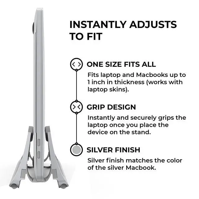 INSTANTLY ADJUSTS TO FIT: No tools or inserts needed; the vertical laptop stand automatically grips the laptop when it is placed into the stand. Fits most laptops and Macbooks up to 1 inch in thickness including those with laptop skins and cases.
