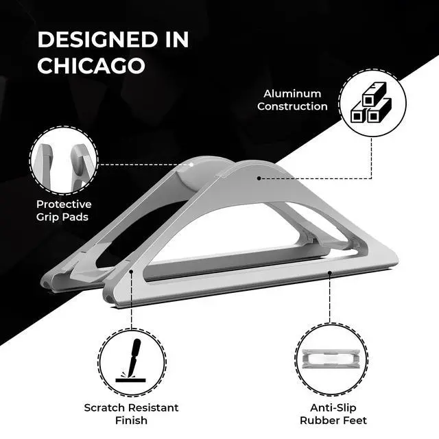 ^^ PATENT PENDING DESIGN: Sleek and minimalist design (multiple US and international patents pending) is both functional and space-saving while adding a unique look and feel to your desk setup vertical laptop stand made of anodized aluminum alloy with a silver finish to color match the silver Macbook ^^
