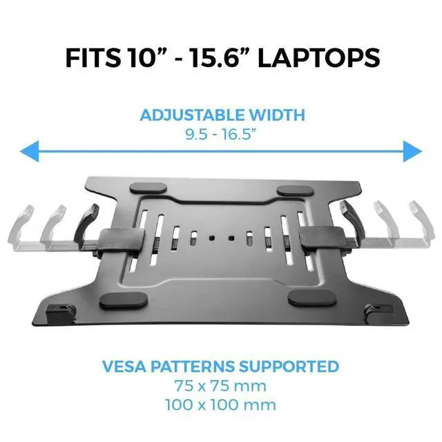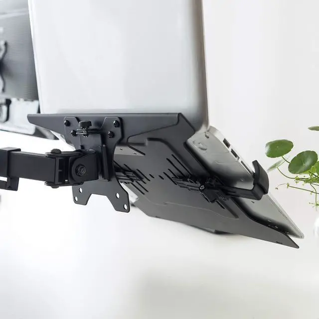 Sturdy VESA-compatible laptop tray designed to securely hold your device on monitor arms, stands, or wall mounts for a streamlined workstation setup. Mounts your laptop at an ergonomic viewing height to reduce neck strain while freeing up desk space for a cleaner, more productive workflow. ^^ Fits 10 to 15.6 laptops and standard 75x75 or 100x100 mm VESA-pattern monitor mounts (mount sold separately), making it easy to integrate into your existing equipment. Perfect for office tasks, remote work sessions, creative projects, and multi-screen gaming setups in home offices, studios, and professional environments.